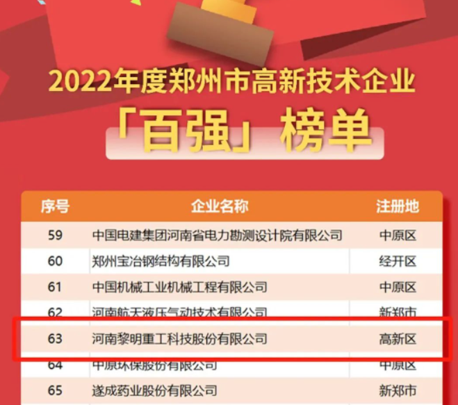 近日,黎明重工再創(chuàng)佳績,鄭州市科學(xué)技術(shù)情報研究所公布了2022年度鄭州市高新技術(shù)企業(yè)“雙百”榜單,黎明重工憑借過硬的企業(yè)實力成功入選。